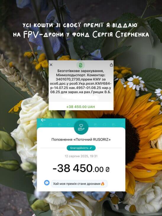 Усю суму своєї премії — 38 450 грн — Віталія віддала на FPV-дрони для збору у фонд Сергія Стерненка.