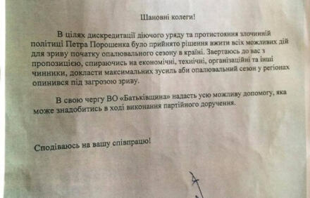 В інтернеті з’явився документ, яким партія «Батьківщина» доручила своїм осередкам у регіонах зробити все можливе, щоб зірвати початок опалювального сезону...
