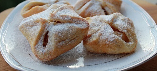 Просіяти борошно з розпушувачем і замісити м’яке еластичне тісто. Залишити його в холодильнику, загорнувши в плівку, на 30 хвилин. Яблука почистити, нарізати тонкими пластинками й скропити лимонним соком. Дістати тісто, розділити його на 4 рівні частини, кожну з яких розкачати в коло приблизно 0,5 см завтовшки. Розділити на 8 сегментів, на кожному з яких зробити по 2 розрізи біля гострого кутика. На широку частину трикутничка викласти шматочки яблук. Присипати їх цукром та корицею. Вузьким кінцем трикутника обгорнути широкий із начинкою, підігнувши куточок під низ конверта. Викласти заготовки на деко, встелене пергаментом. Змастити зверху збитим яйцем Присипати цукром. Випікати в розігрітій до 180ºС духовці близько 20 хвилин. В процесі випікання печиво дуже росте, тому варто робити відступи між ним при складанні на деко. Коли конвертики трішки охолонуть, посипати їх цукровою пудрою.