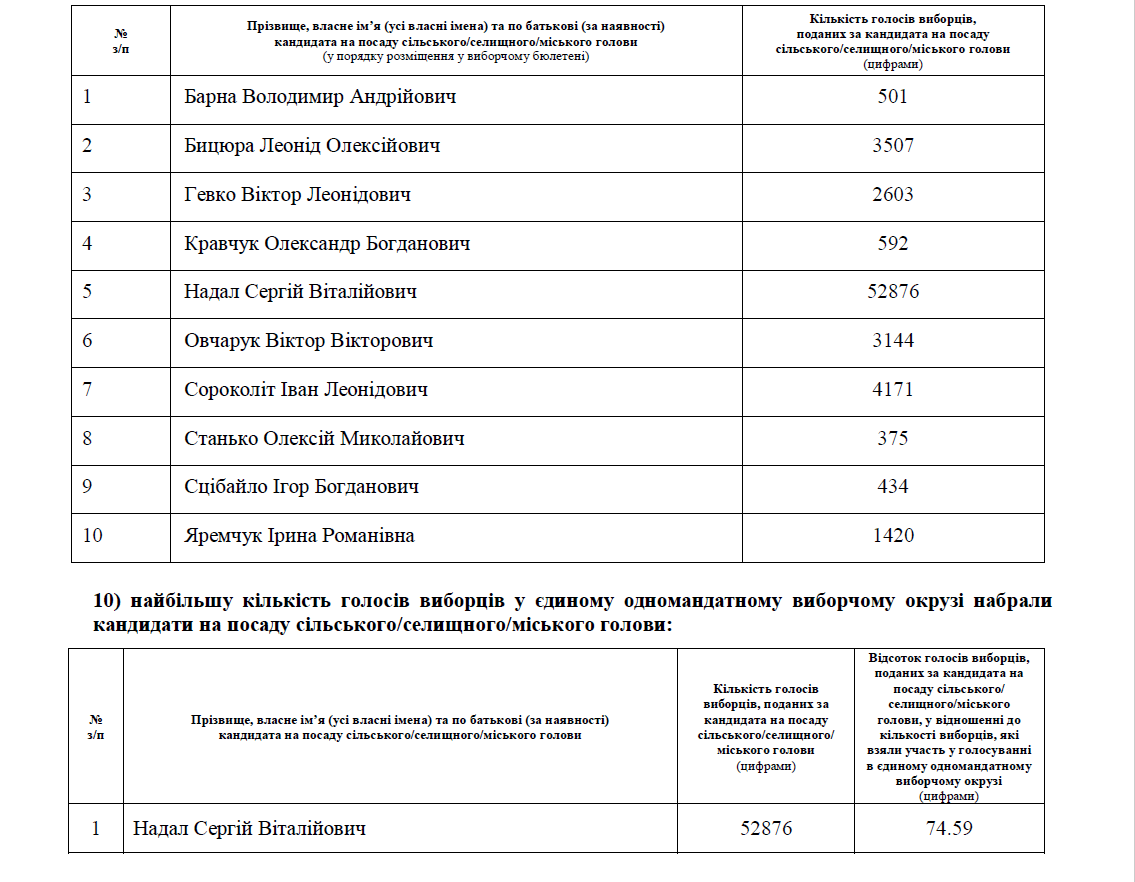 Міським головою Тернополя став Сергій Надал (ВО “Свобода). За нього на місцевих виборах проголосували 52 тис. 876 виборців (74,59% від тих, хто взяв участь у голосуванні). На другому місці – Іван Сороколіт (“Сила людей”), його підтримали 4 тис. 171 виборець. На третьому – Леонід Бицюра (“Батьківщина”) – 3 тис. 507 голосів.