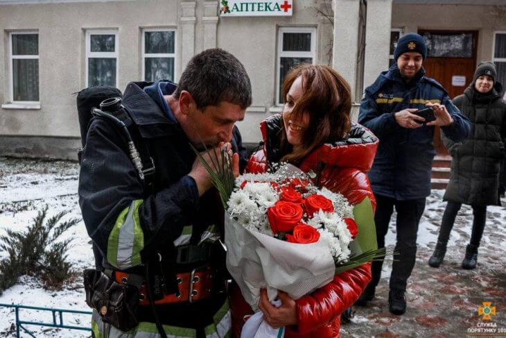 29 січня рятувальники провели тактико-спеціальні навчання у медичному закладі, де працює Надія. Пожежа «виникла» у дитячому відділенні цього закладу. Умовно евакуювали пацієнтів, з будівлі вивели персонал. За лічені хвилини на місце прибули бійці Служби порятунку, серед них – наш герой. За планом навчань, двоє працівників медичного закладу на пожежі зазнали травм і не могли самостійно вибратися з приміщення. Звісно, однією з потерпілих була Надія. Василь, в апараті для захисту органів дихання, який щільно закривав обличчя, виніс кохану на свіже повітря. Дівчина через емоції навіть не підозрювала, хто ж саме її рятівник. І ось він зняв маску та став перед шокованою Надією на коліна, запропонувавши руку і серце. Дівчині від щирого здивування перехопило подих. Та за мить усі присутні почули жадане «Так». Щиро бажаємо закоханим щастя!