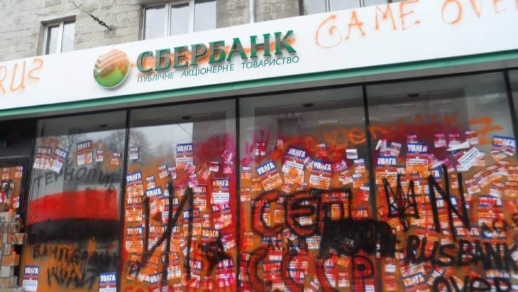 Як повідомляють активісти на сторінці у Фейсбуці “Правий сектор Тернопільщини”, Націоналісти вже неодноразово попереджали адміністрацію про можливі акції прямої дії, якщо банк не припинить свою роботу добровільно. Тому активісти обклеїли вікна офісу інформаційними листівками та замурували вхід до нього.